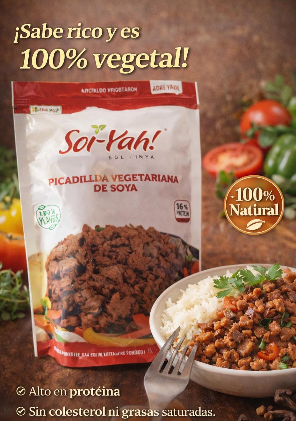 Soya texturizada, harina de gluten de trigo , aceite de maiz , especias naturales ajo y comino